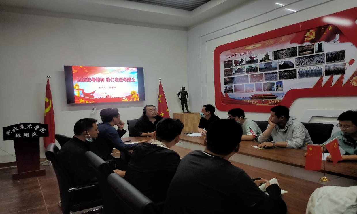 2021年5月21日雕塑院直属党支部书记曾维林在文峰塔一楼党员活动室给全体教师和学生宣讲了弘扬赶考精神我们在赶考路上。