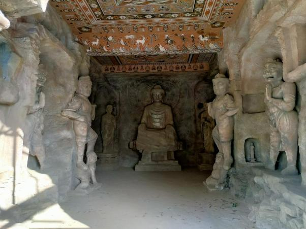 窟内壁画与雕塑的风格、色彩、时代性相接轨,整体层次简约,造型结构单纯,元素重复均衡,色彩沉着浑厚,整窟设色主要以赭石、石绿、钛白、朱红为主,使顶部壁画与窟内雕塑达到统一和谐,使其艺术形式内容和公众审美通感与文化共识相适应。