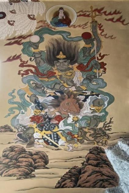 窟内壁画顶部藻井为隋唐时期风格,墙上壁画为明代风格左边为大威德明王,右边为马首明王,整窟壁画色彩沉稳庄重,生动协调。